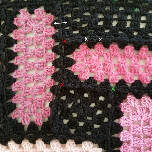 This picture shows the joining positions of the motifs. Notice that they are joined along each side at the ch-1 spaces with a sl st to the neighboring square's ch-1 space and at the corners with a sl st to the neighbor's ch-3 corner space. The red Xs are places where you will need to sl st to both the upper and left neighbor (internal corners) when joining at the corner. The green X marks the position where the black square would begin joining to the upper right rectangle as you work Rnd 3. The two white Xs show regular sl st joins. Also, note that with all of the joining, the neighbor's Cl is directly across from your working motif's Cl.