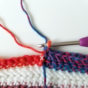 When it's time to drop the old color (here the blue one) work to the last part of your hhdc (or final yarn over of the last stitch of the old color). Then yarn over with the new color (red here).