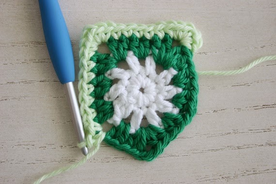 Now with a new contrasting color, join with a sc in that upper right corner ch-sp. If you haven't done this before, start with a sl st on your hook. Insert your hook, yarn over, draw through the space, then yarn over and complete your sc. Easy peasy. Now stay with me..work a ch-1 and another sc in that same corner ch-sp--corner made. Then sc in each st to the next corner.