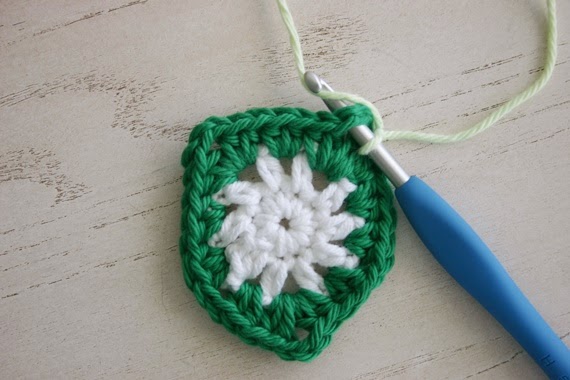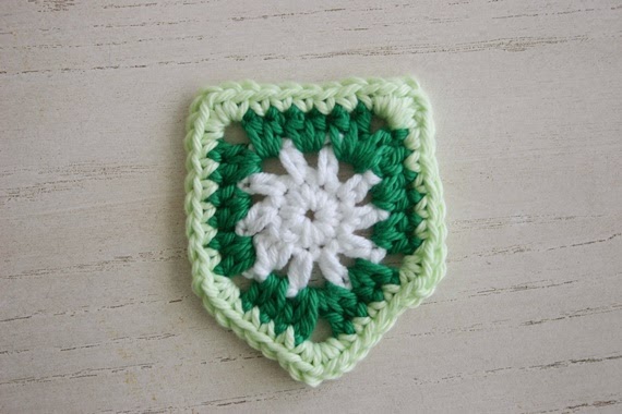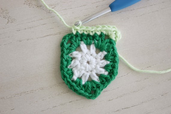 Now you are at the tip of your flag. Work (2hdc, ch 2, 2hdc) in the next space. And then 2hdc in the next ch-sp.