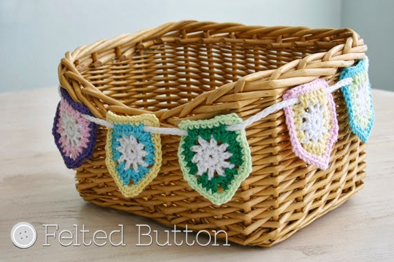 I made the little string to hang them by making a chain as long as I needed to go around my basket and then slip stitched along the length. Then I used the little corner spaces to weave the string through.