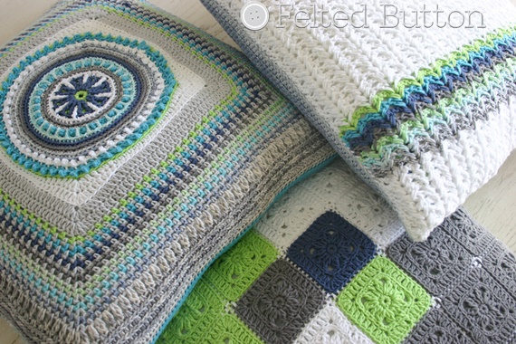 The patterns will also include instructions for the back of the pillows. In typical Felted Button style, I couldn't make them in just one color--but you can if you wish. They would look pretty terrific in all crispy white! And, of course, the whole button thing is super fun.