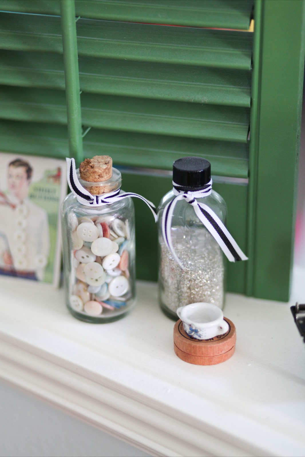 This bottle of vintage buttons are wonderful--but all buttons are wonderful! And the bottle of glitter is from my childhood--it used to be tucked away in my mother's closet. How excited I always was as a child when my mother pulled them out for some sparkly fun! The green shutters are a thrift store find--sprayed green--acting as a divider on my ledge between my entry and "purple room".