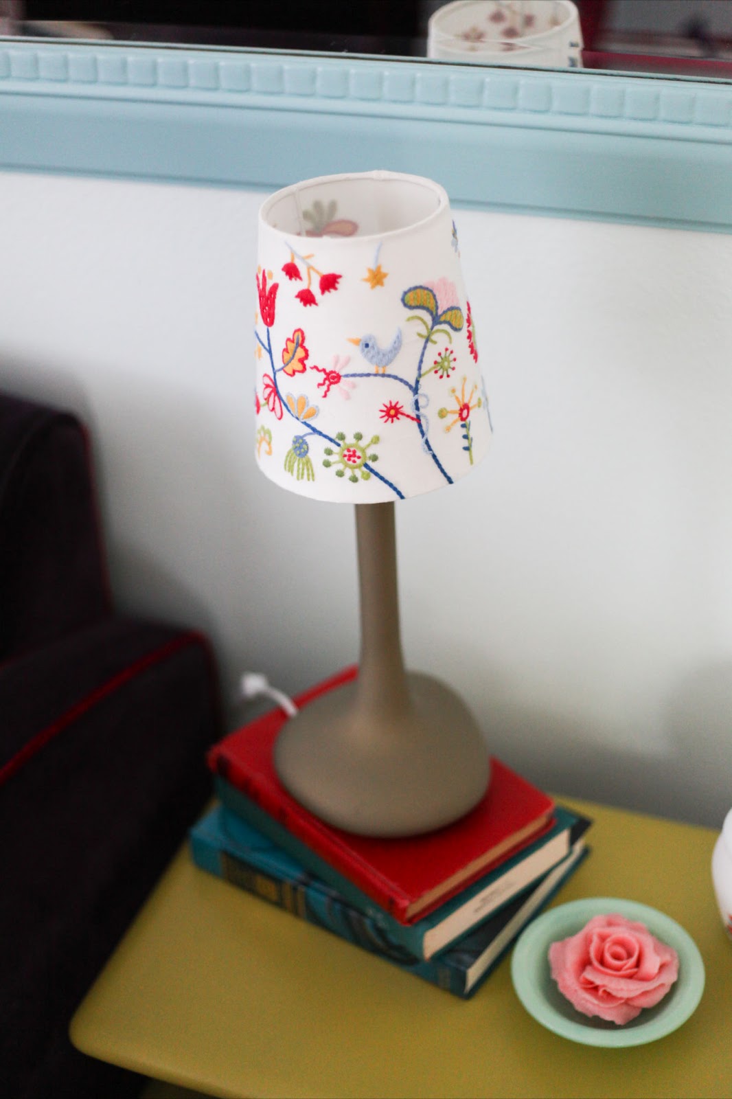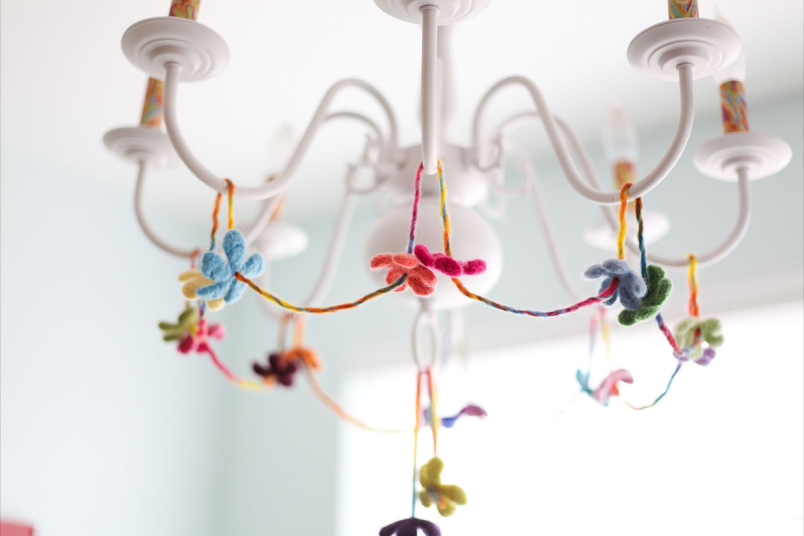My ugly brass chandelier re-do. A little white spray paint, some scrapbook paper over the sleeves, a colorful felted flower bunting. Perfectly me.