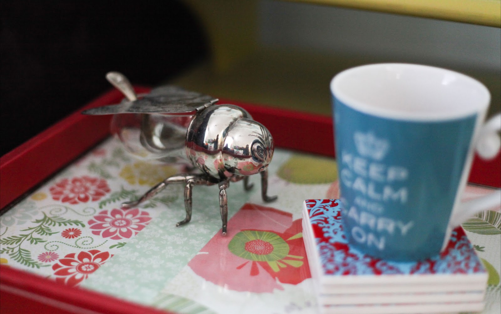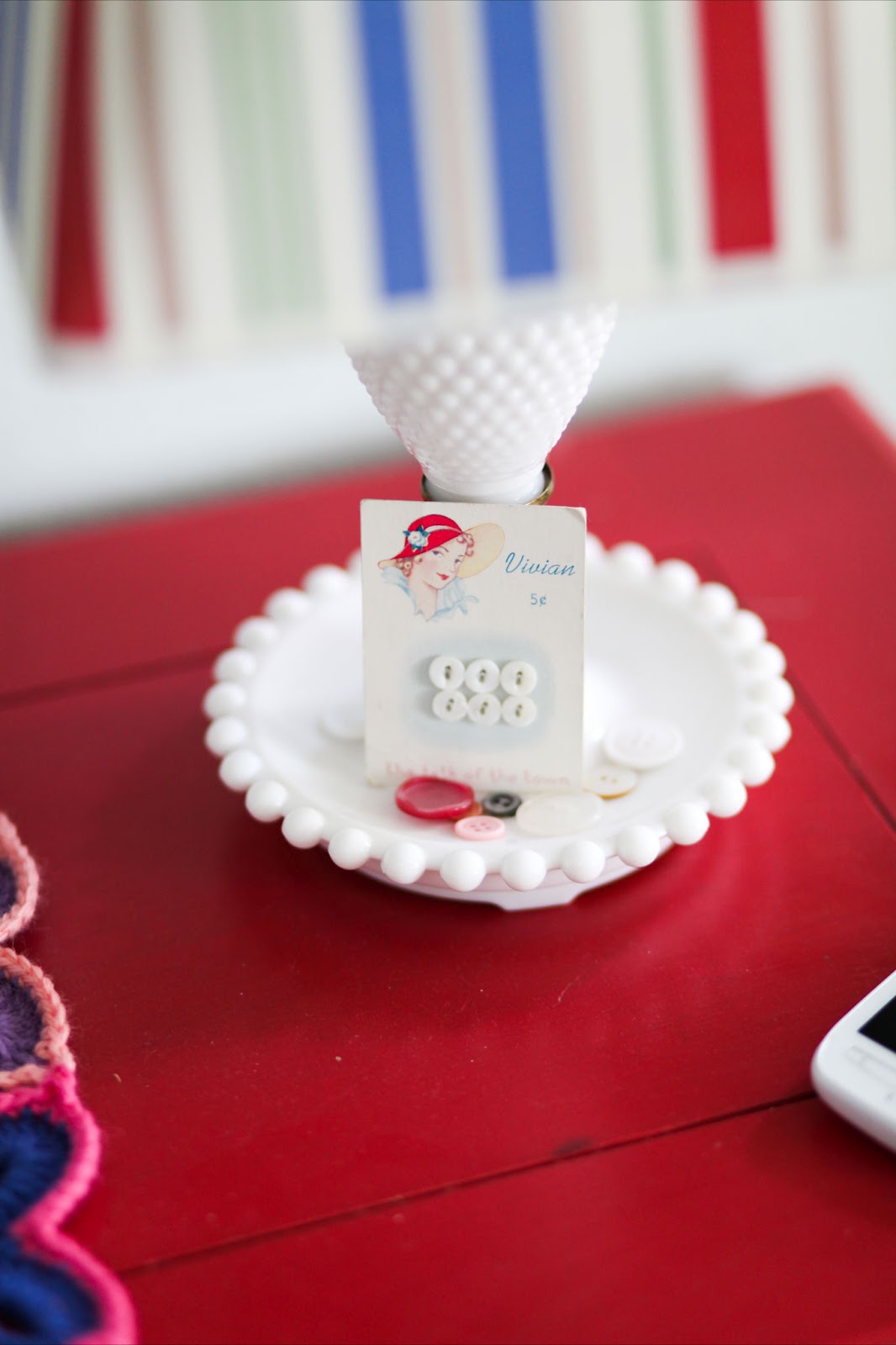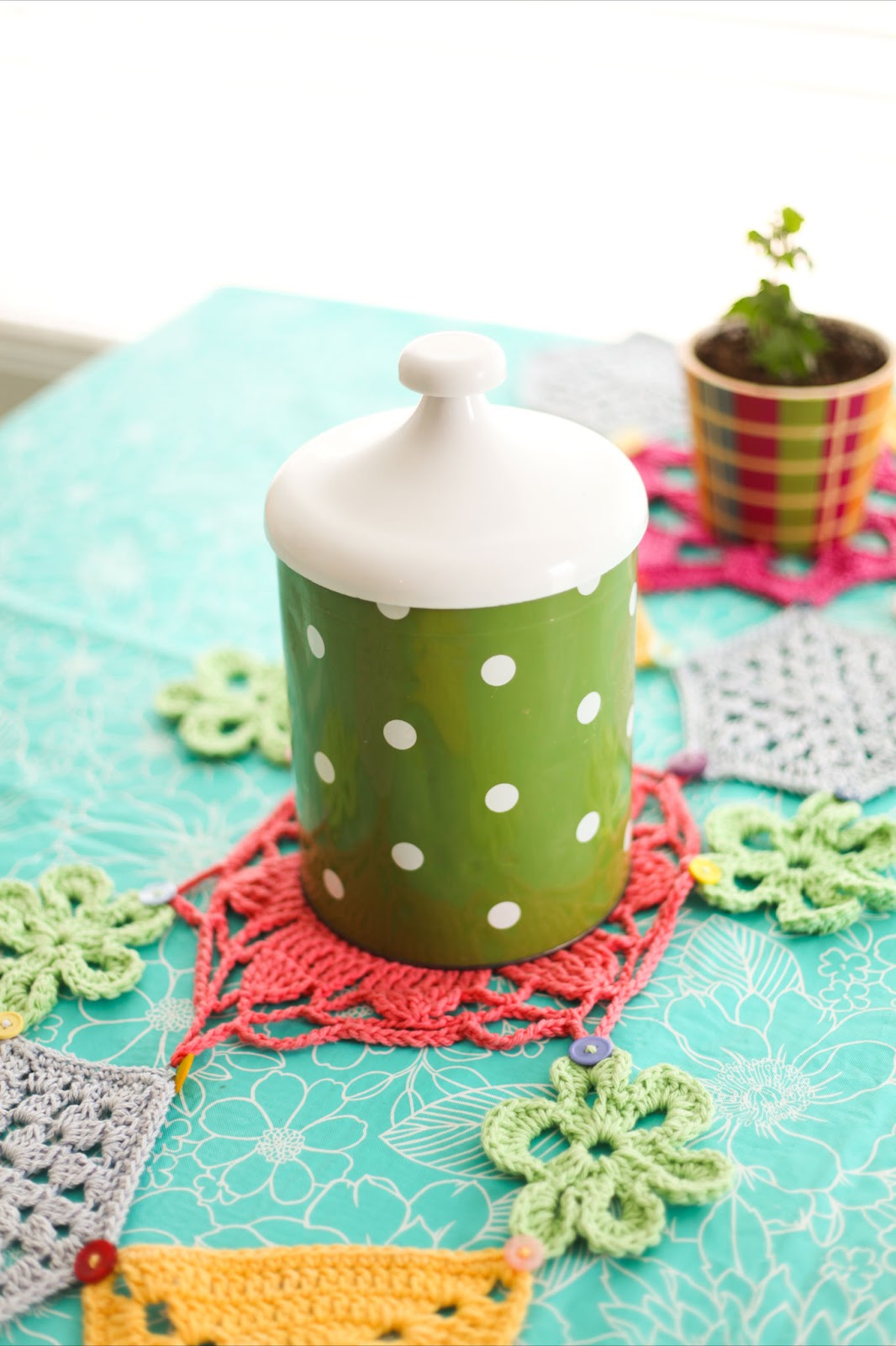 Aren't polka-dots always wonderful!? I think so! And, of course, a colorful table runner of crocheted motifs--connected with buttons, of course.