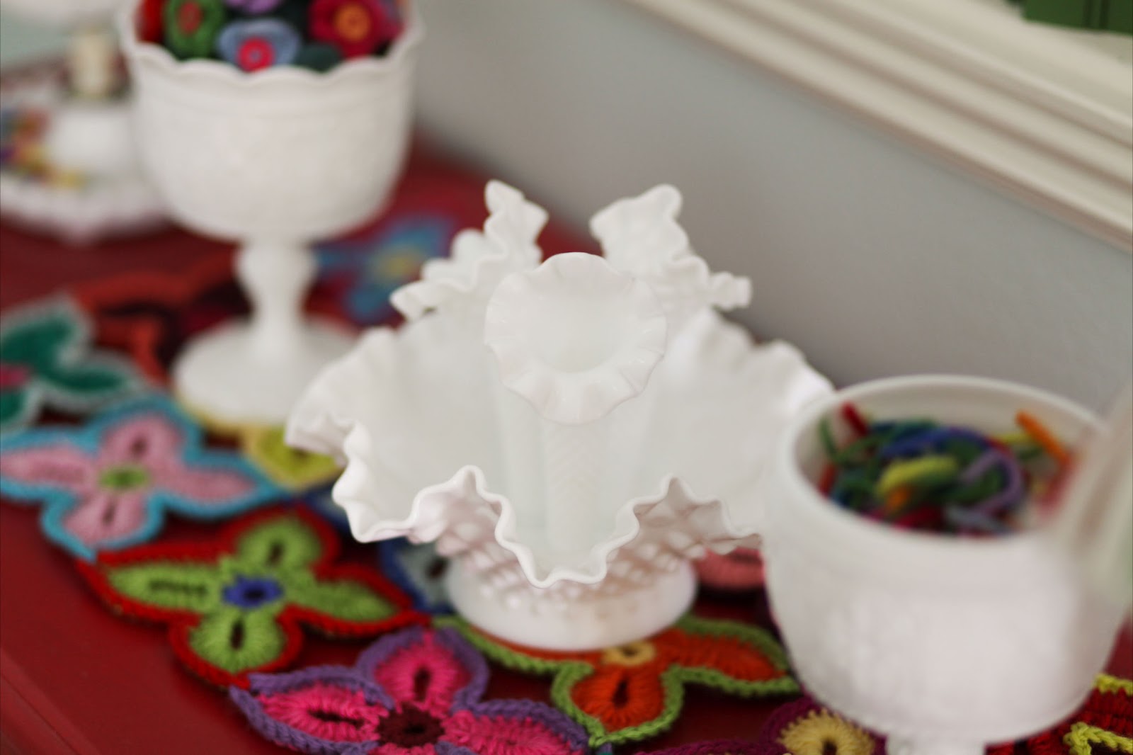 Lots of milk glass, crochet, and bits of yarn I can't seem to part with.