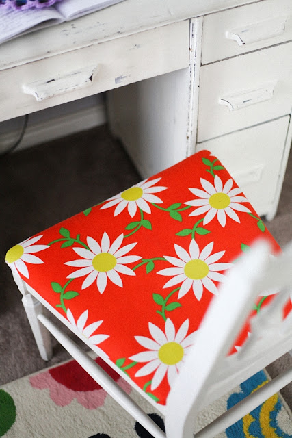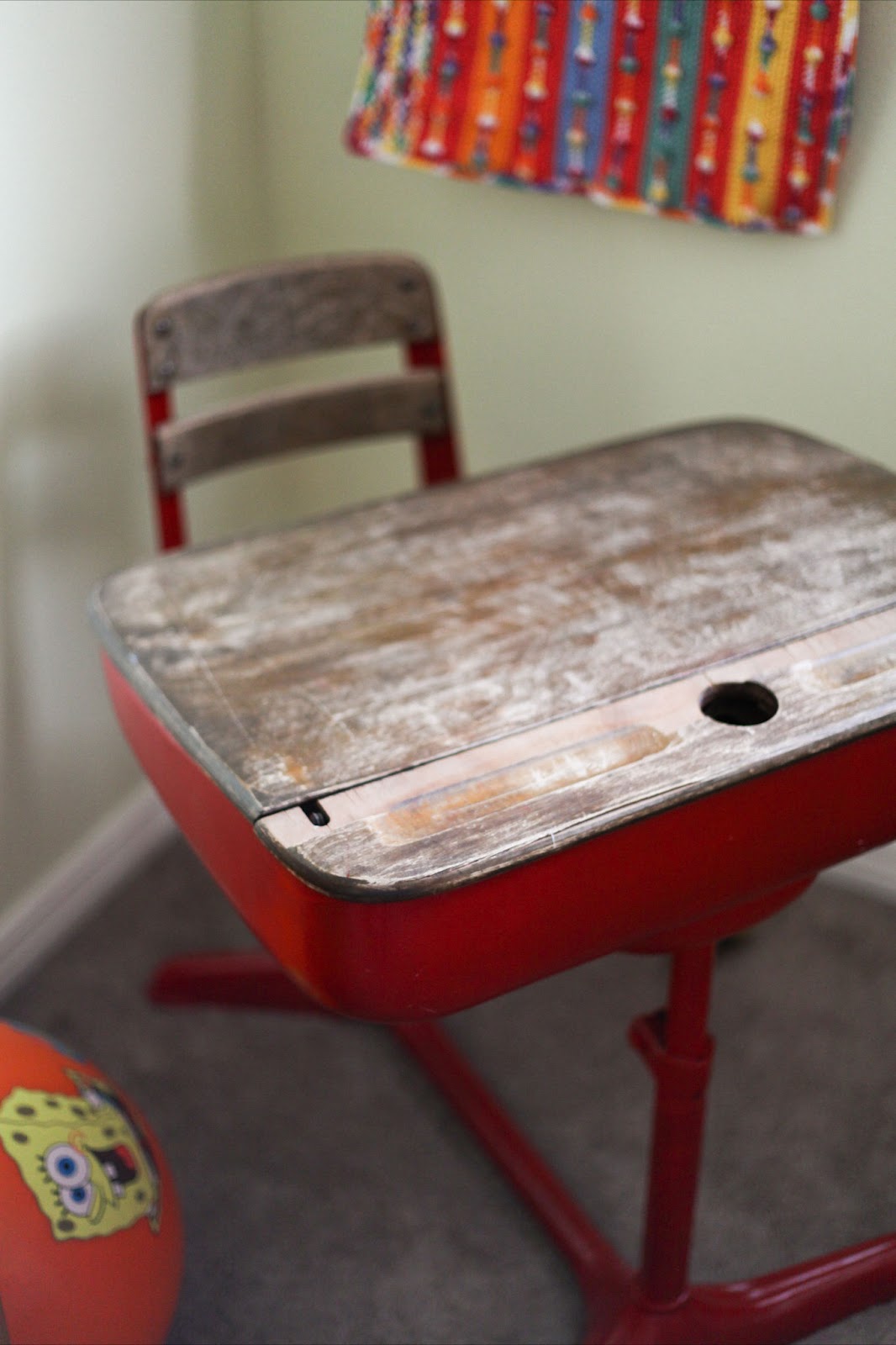 A sweet vintage desk from the thrift store--painted red. Should I paint the desktop with chalkboard paint or not?