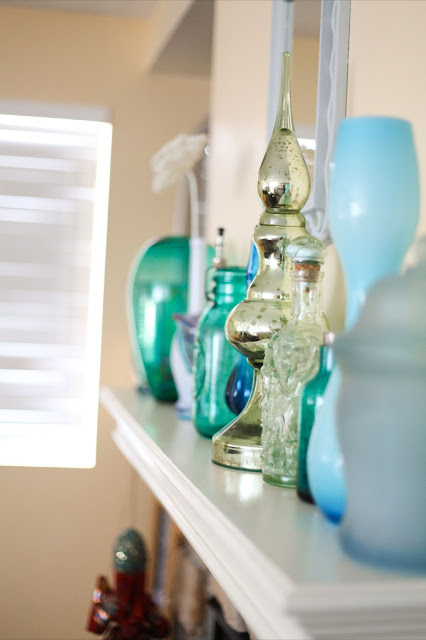 I have a hefty collection of colorful glass--primarily from the thrift store. I love the eclectic mix, the colors, the shapes.