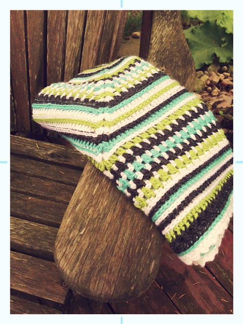 I really like the "randomness" of the pattern. It is playful and fun and interesting and textured, and versatile and well, terrific! I'm currently making a second in pinks and greens and a third in pinks and purples. Imagine the awesome color combos that are possible!! One of my testers came back with these more earthy color combos...(Thanks, Christine of Yarnacles!)