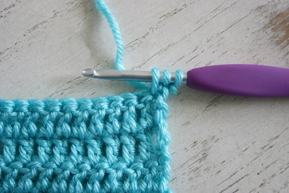Then insert your hook into the top of the first stitch of the row. Yarn over and draw through the stitch.