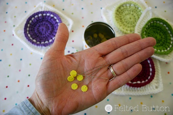 Now get those little beauties pinned down. Use as many pins as you need to hold it in place. If you spray them slightly before pinning, that yarn will get stretchier and more willing to shape. Then spray again lightly, if needed. You don't want them drippy and soggy. Just damp.