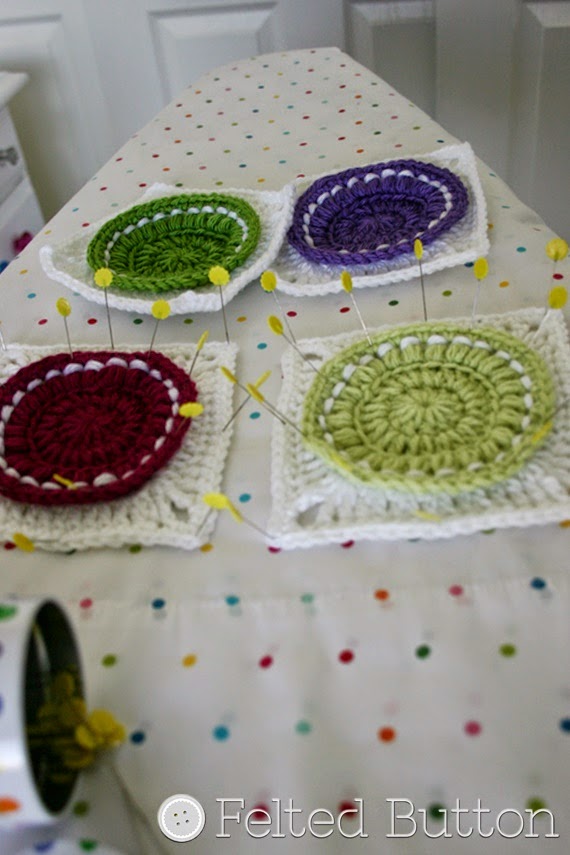 Now, what if you made a baby blanket or afghan--say, not with motifs or worked join-as-you-go--and it has a wonky border or just doesn't seem "square"? I've blocked finished blankets on my ironing board, as well. It is a little less precise and needs to be done in sections, but is still do-able. Hey, we crocheters are creative, right?