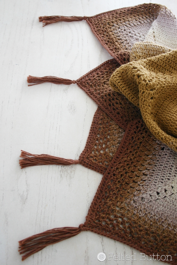 To make the tassels, cut nine approximately 8in/20cm lengths of yarn. Fold in half and insert the folded loop through the corner st with the RS facing. Insert ends of yarn through loop and pull down to tighten the tassel. Repeat for the other corners. Trim evenly to the desired length.