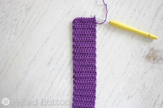 Now weave in the end you just fastened off, but save that long starting tail for sewing on your button at that end. I just used my needle to weave that end to the position in the middle of the piece and sewed on the button. Pretty easy, huh?