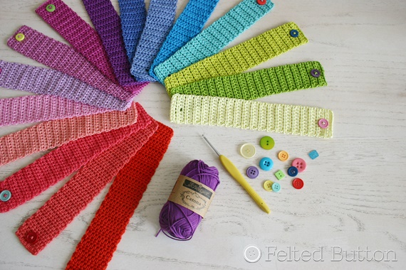 With my plentiful stash of lovely Scheepjes *Catona, I quickly found all of the colors that make me happy, then raided my button stash, and made these colorful little strips. (You can read more about Catona here.) Quick, simple, colorful--and with BUTTONS! Can't beat that!