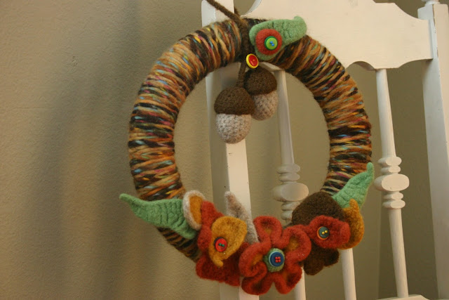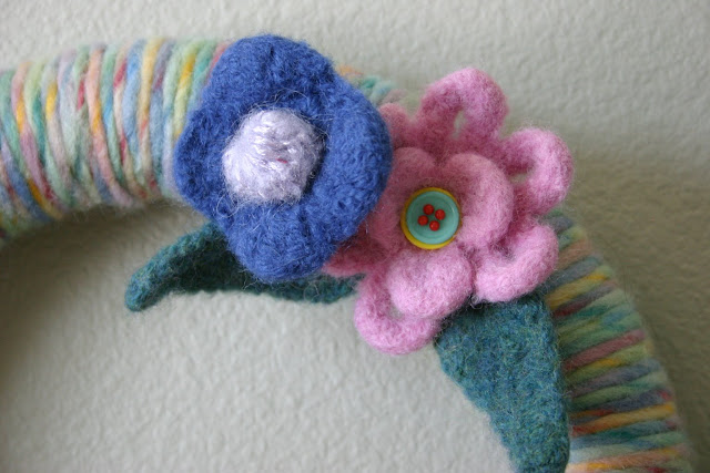 Yet another variation of the yarn wreath in softer, more pastel shades. Did I mention that wool makes me happy? Especially when felted. Any mistakes or imperfections sort of disappear. I like that because I make plenty!!