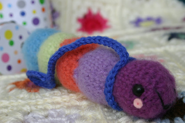 A little caterpillar amigurumi. Don't ask me why but it made me think of "take your friend to work day" so I made him a mini leash. This was my first attempt at brushing wool. I love that it made him fuzzy. Now I want to try it with angora!