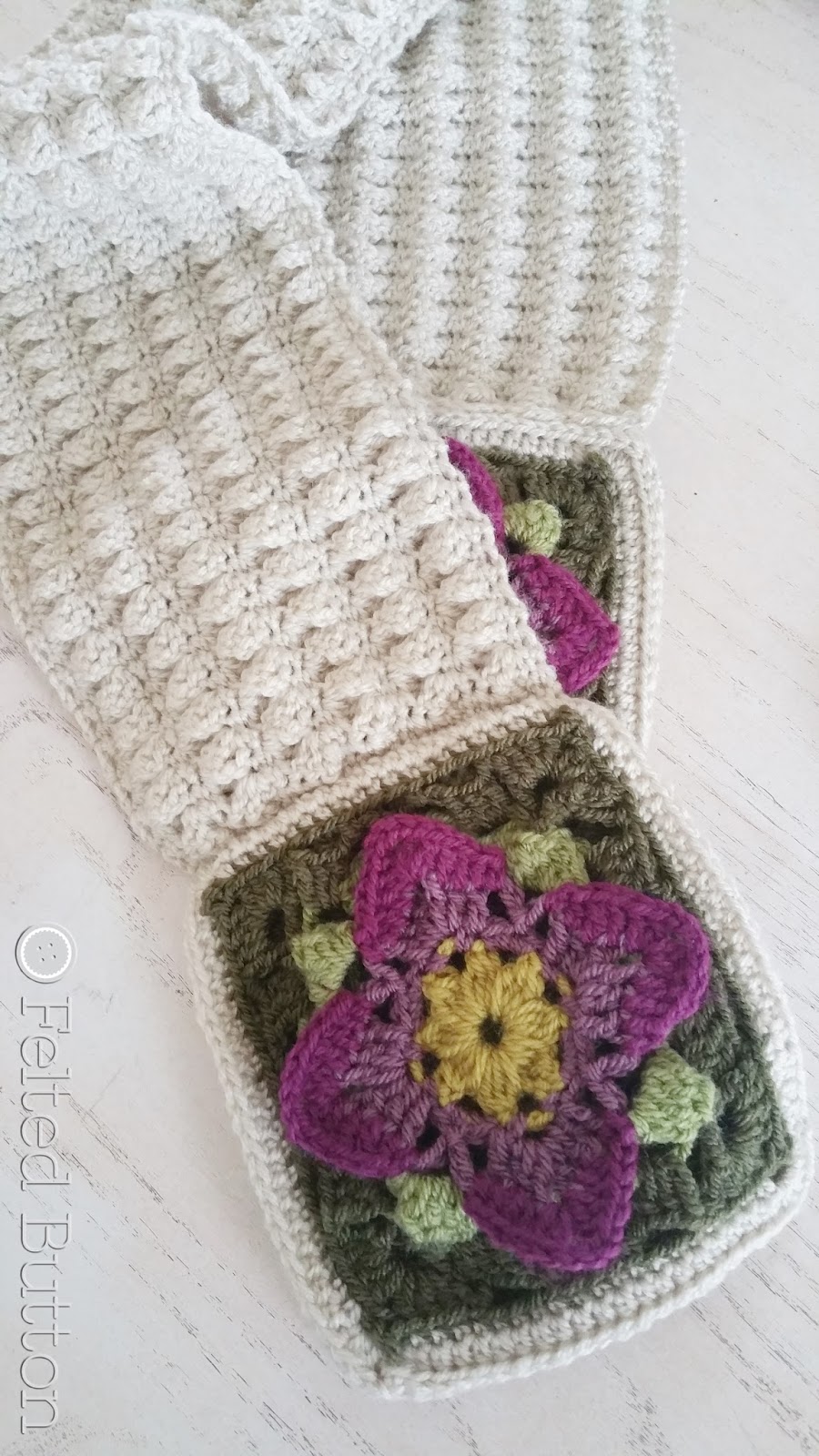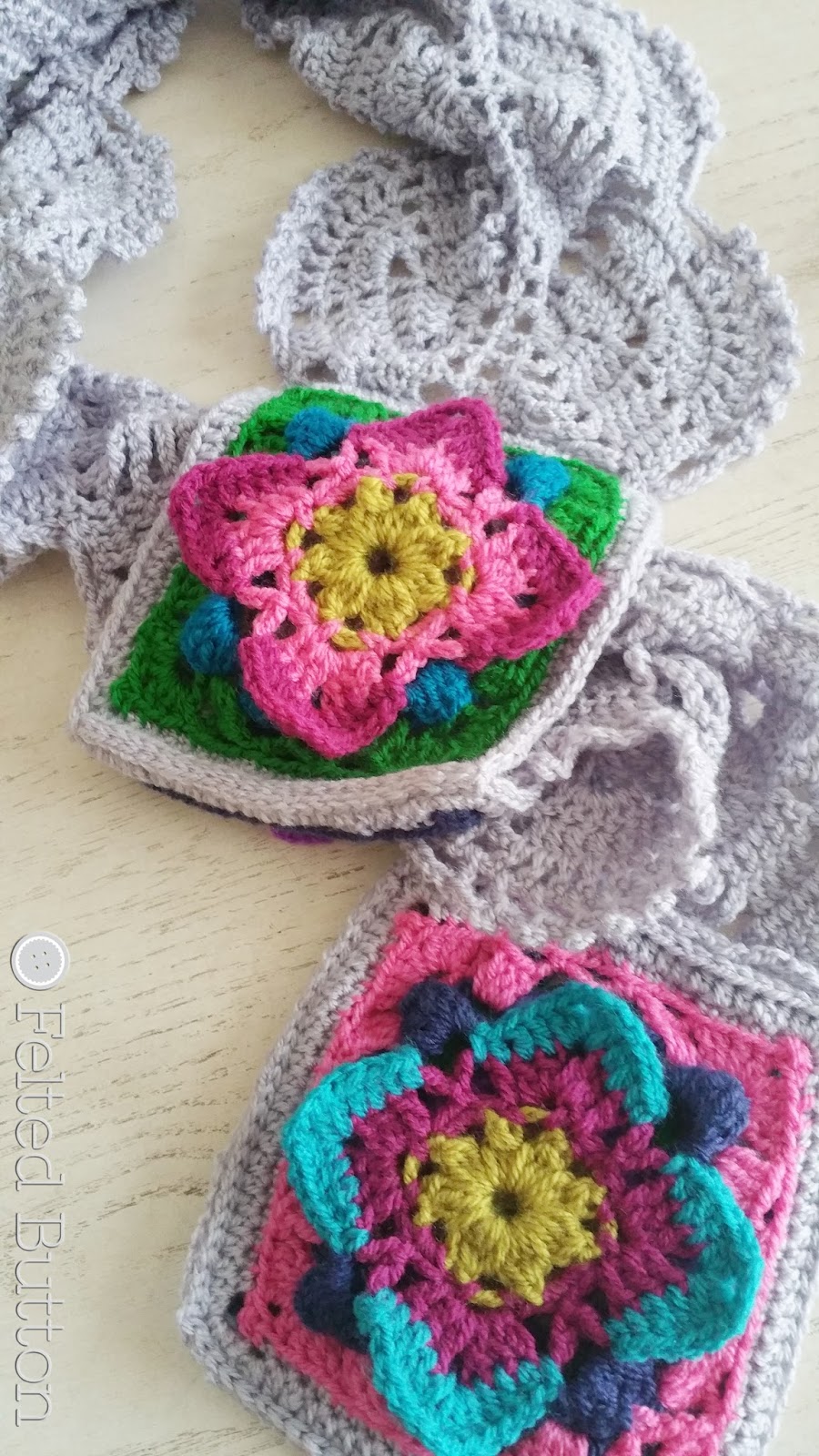 And then my brain began to work to envision a scarf--where the length could be easily adjusted, where it could be held snuggly in place by threading one end between the motifs--where you could really have fun with color and make it suite your style or favorite outfit!