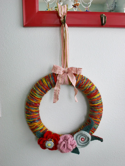 Sweet and colorful little yarn-wrapped felted flower wreath made for a customer this year. I didn't do much custom work--turned down most of it due to focus on pattern development. But this one was just too fun to pass up.