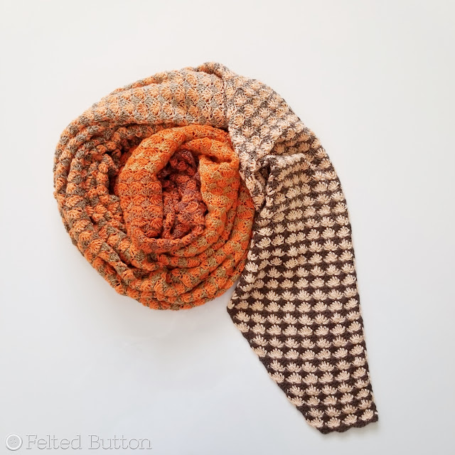 And these are just a few ways. I like the versatility of the shape which starts as a rectangle at the base up to about 46" (117cm) and then begins decreasing to nearly a point. I suppose you could work it to an actual point if you start the decrease rows a couple of rows sooner, but I like the shape of it this way. You simply go until you run out of yarn. Gauge isn't super critical here, but to give you an idea of my gauge, in pattern I worked 4 shells X 10 rows = 4” (10cm) which gave me a shawl with dimensions of 27” (68.5cm) wide at base x 72” (183cm) long. It's substantial enough to cover your shoulders and even be work like a poncho, but drapey enough to wear like a scarf. And, bonus, only 4 ends for all this color!