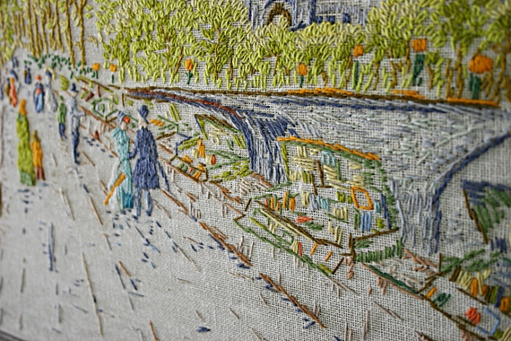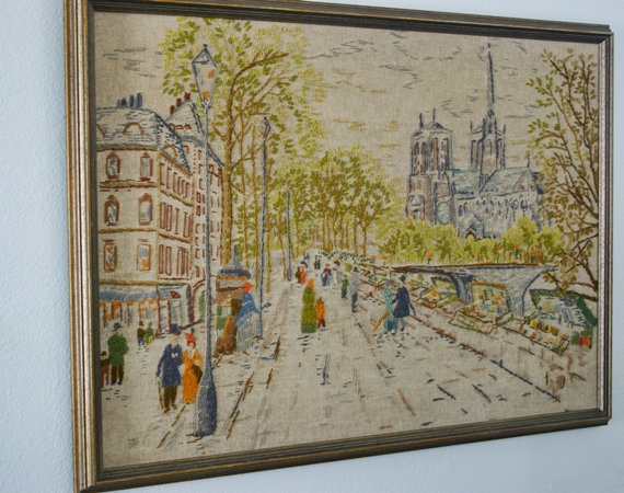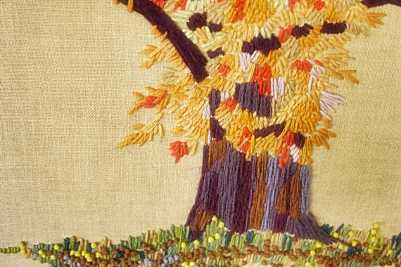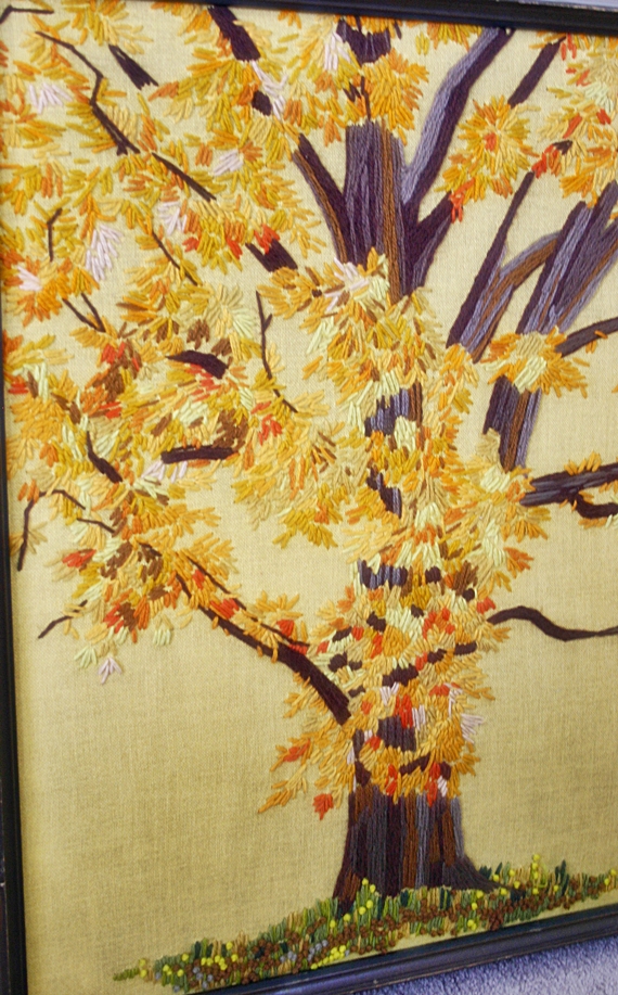I also found this lovely embroidered tree. Again, $4. I really like it. Not as much as the "squeally find" (maybe it is that brown), but I like it nonetheless. The colors and details in the leaves and trunk are fabulous. And the collection of french knots for the soil and flower buds are so great! This frame will also get painted something lighter.