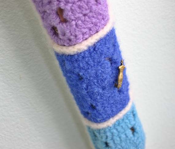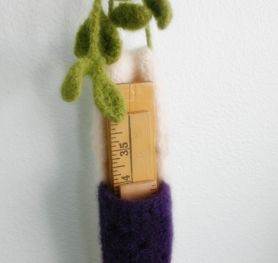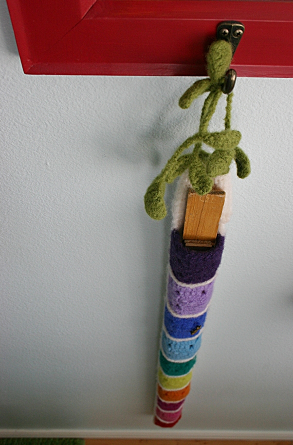 I made it a while back out of desperation to solve the problem of storing these babies. A few colorful wool granny squares, joined together, felted with a leafy string for hanging and Ta-Dah!