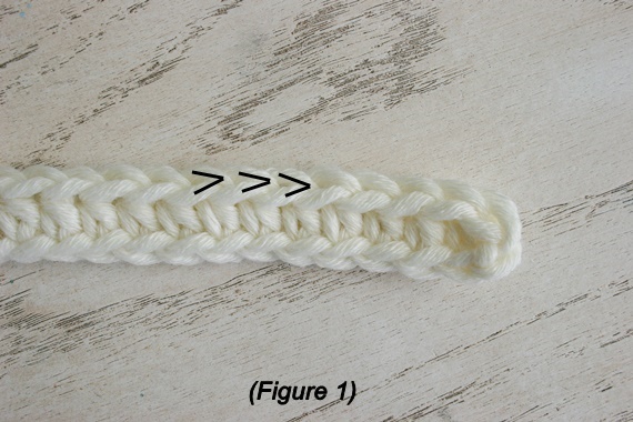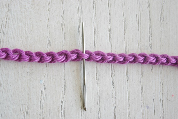 On the back of the chain you can see a row of bumps that run horizontally along the length of the chain. These are the back bumps and the needle is inserted through this bump. You'll insert your hook into this loop when instructed to work into the back bump of the chain on Rnd 7. This will leave the pretty V undisturbed and make for a neat-looking chain loop at the corners.