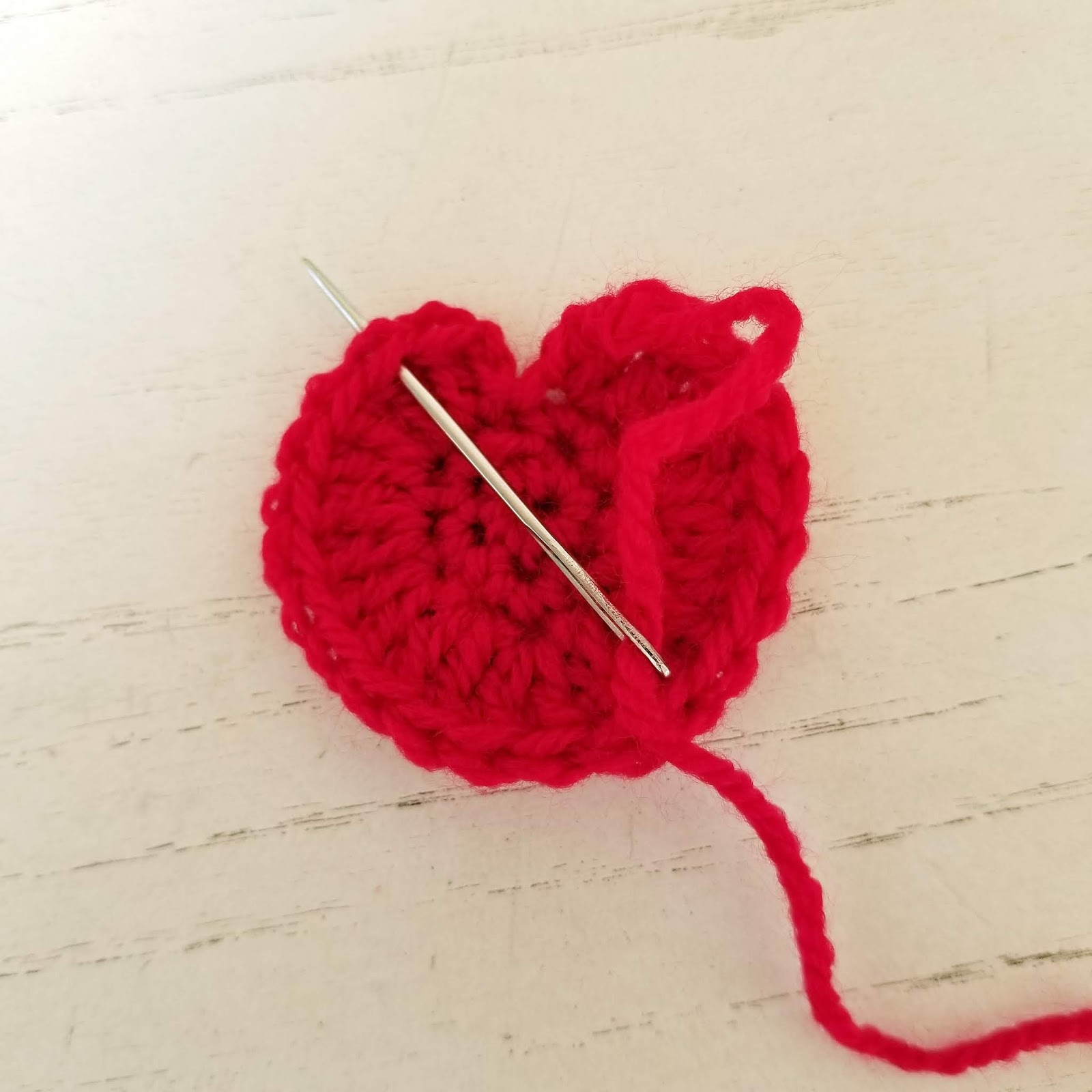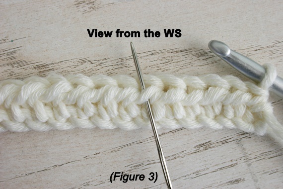 When you are ready to invisible join at the end of a round (like here on Rnd 3), complete the last stitch, cut your yarn and pull the tail through the last stitch. Thread your tail on a needle. Then skip the first st of the row. (If your first beginning chain counts as a stitch, skip that one.)