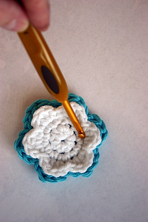 With H hook, repeat small flower instructions. The larger hook size will make a slightly larger flower that can then be seen behind the smaller one.