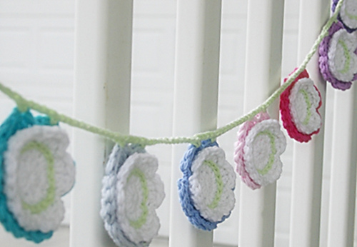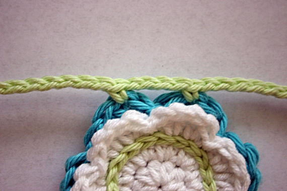 Note:: You can always adjust the distance between flowers by changing up the number of chains between each flower. You can also add or subtract flowers to adjust the length.