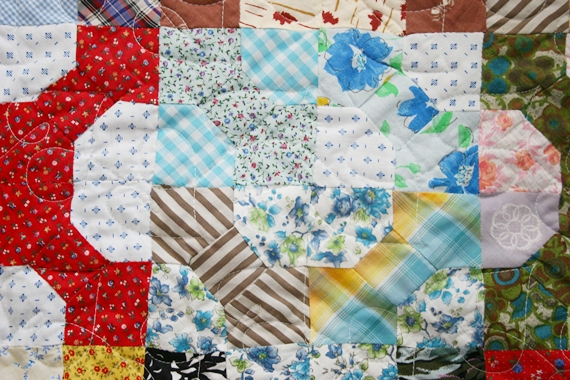 It's a bow-tie quilt that my mother got from my Great-Aunt Radie. I remember Aunt Radie's little yellow clapboard house that smelled a bit funny to a me as a child. I remember how she welcomed us with such delight every time we arrived, and how she covered her mouth when she smiled as she was missing several front teeth. This quilt was made from pieces of her own dresses.