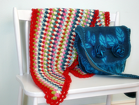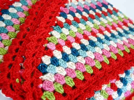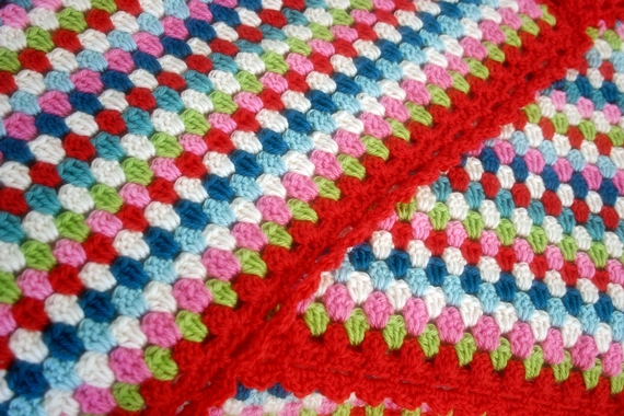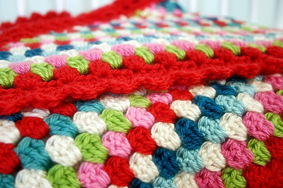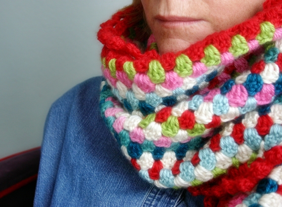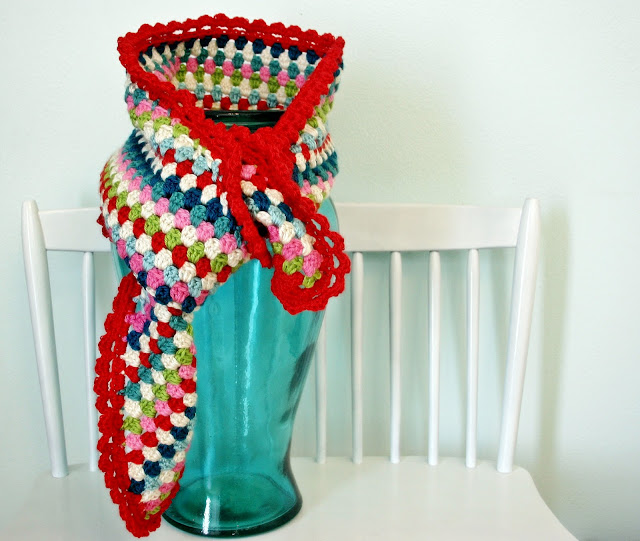 I found this pattern on Tangled Happy but ended up loosely following it. Here's a brief run-down--I just chained multiples of three until it was long enough to wrap around me, did a hdc foundation chain, and then off with the granny colors for about 35 rows, shortening each row by a cluster or two on each end. I did the scallops with a row of sc, ch 2, sk 2 sts and then a second row of (sc, hdc, dc, hdc, sc) in each ch 2 space. Easy peasy.