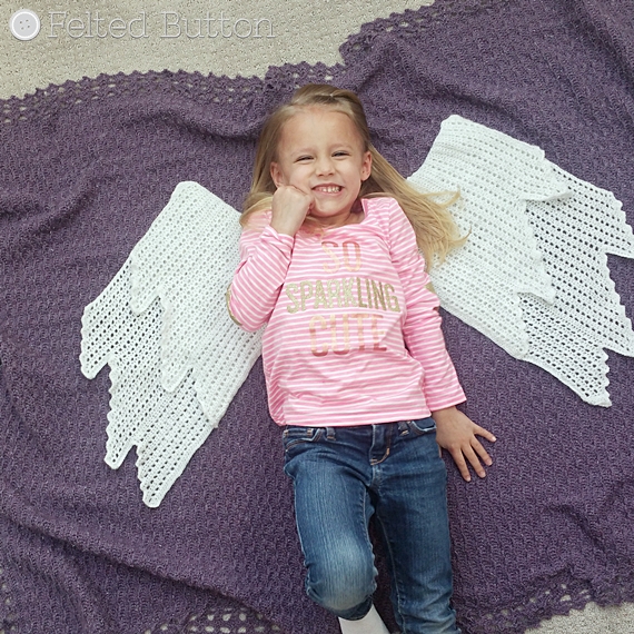 Cute little girl in pink shirt lying on purple blanket with white angel wings, smiling, Embraced By Angels Blanket crochet pattern by Susan Carlson | Felted Button | Colorful Crochet Patterns