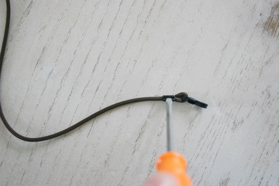 I measured my cord to the ugly brown one before fastening off, inserted my i-cord end through the rubber part of the glasses holder, folded it over on itself added the toothed clamp around the end...