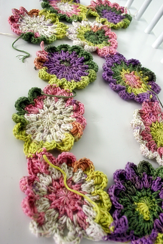 Ta-Dah! This is my Infinity Blossom Cowl! I love this cowl--the colors, yarn, flowers, little diamonds in the center--and the fact that it can be wrapped or left long.