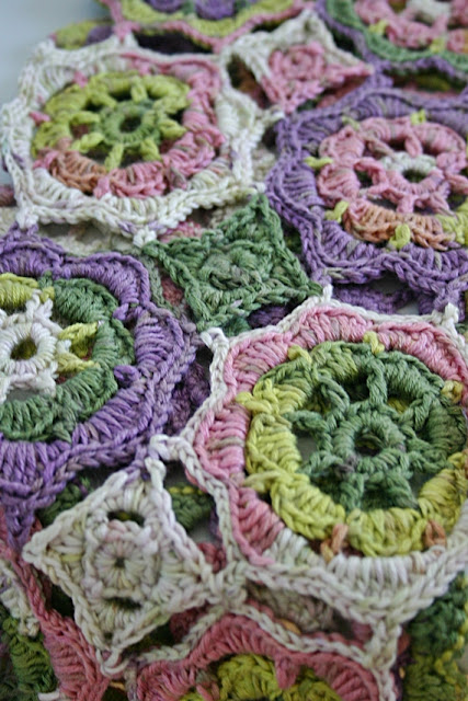 Remember this Japanese Flower WIP I wrote about back here? Turns out, I was following the diagram incorrectly in the center which made the flowers wonky at the petal edges. So there it sat in one of my many baskets of UFO's until I decided it was going to become part of my next pattern! Because the yarn is so altogether yummy--soft, drapey microfiber sock yarn with awesome long color runs, I had to use it for something lovely against the skin.