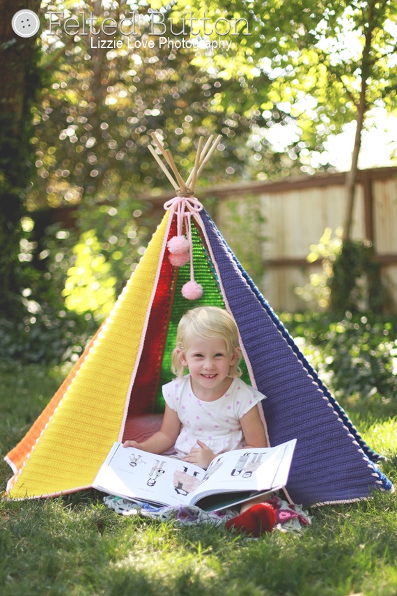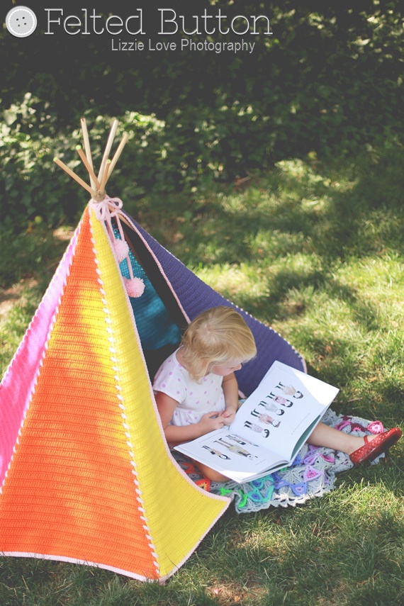 the Toddler Teepee is super fun! I made the sample in a rainbow of colors but you could make it in your little one's favorite colors or to match their bedroom or playspace. I also decided to make it with Red Heart Super Saver yarn as it is affordable, durable for play and has a superb color selection.The other great thing about this teepee tent is that it is super easy to make. I intentionally made the joining of the triangles super simple using a whipstitch of contrasting yarn. I purchased the six dowels at my local Home Depot ($1.67 each), lashed the tops with twine and draped the cover over the frame--fastening it at the top with pom-adorned ties worked as part of the border.