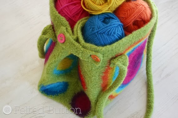 Now, if you look at this and think, "Wow, I would like to make that, but I have never worked with wool and felting." FEAR NOT! In the pattern I walk you through the steps of felting--which can easily be done in your washing machine. The results, a sturdy, strong and durable bag which will last! Oh, and did I say...no need to weave ends as you can just trim them after the felting is all done!