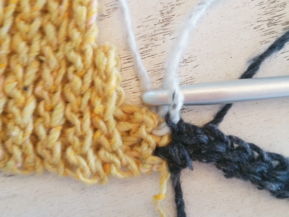 Note: This is a good place to adjust the length of your scarf if you wish. Chain as many or as few as you want here. You can also avoid weaving ends by not fastening off between rows and just dropping the old color and picking up the new color. Draw through the new color on your last draw through of the final slip stitch of the row.