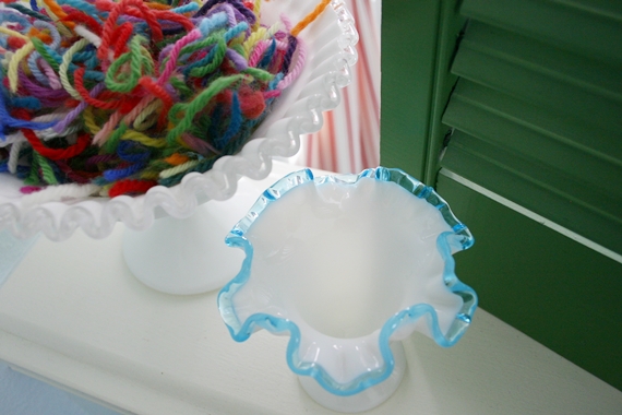Another Fenton milk glass vase. This one with the blue ruffled edge is wonderfully wonderful!