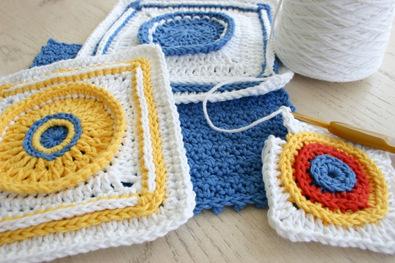 My mother got some dishcloths for Mother's Day. I started with my Bright as a Button square and then worked a totally cool new border on it. Which led to the yellow square. Different textured circle--layered with a little peek-a boo hole in the center. And then the "Three-Ringed" Circus square. (Hey, that name could work!) I love when wonderful things just happen as I play with my hook and yarn. Don't you?