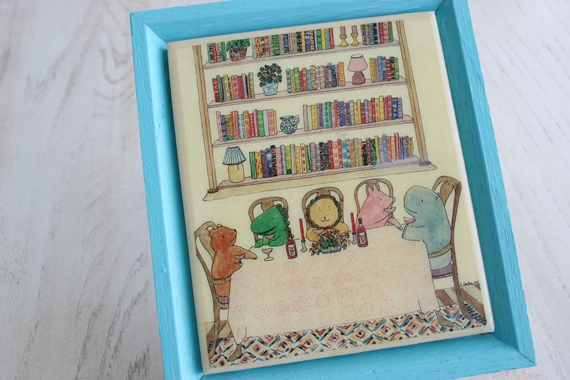 Another sweet little thrifty find was this framed tile. I already painted the frame an aqua blue. I love the patterned rug, sweet little lunching animal guests, but mostly I love the colorful and abundant bookshelf! I love books. And I especially love colorful and good books.