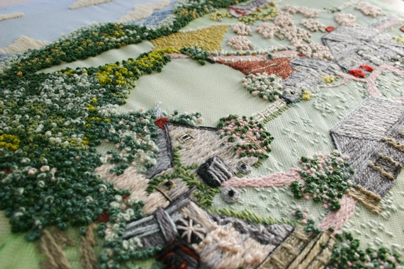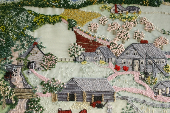 I cannot imagine how long it took to make all of those french knots. I love the pink pathways, the blooming apple orchard, the pops of red, and the turbulent water. Very, very delightful!
