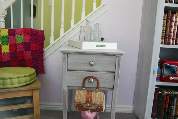 Last week I painted my front room a wonderful shade of pinkish purple. Oh, how delightful it feels in that room now. And I whitewashed the bookshelf and this little end table. I added some colorful button knobs and it's perfect for Sue. (Don't mind the hidden pink object--it is actually a pig with wings--you know, for WHEN PIGS FLY!)