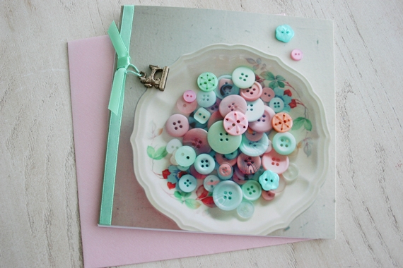 And another VERY "Sue" card with buttons just my colors in a vintage bowl. It's hard to tell which buttons are real and which are part of the picture, huh?! This one is getting framed, too.