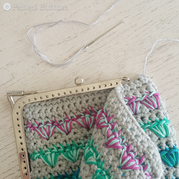 Then I worked around the corner and up the rough side until I reached the point where the purse frame would need to be joined to the edges. Continuing with my whipstitch and opening the frame, I inserted my hook down through one fabric edge, and then up through the next hole on the purse frame.