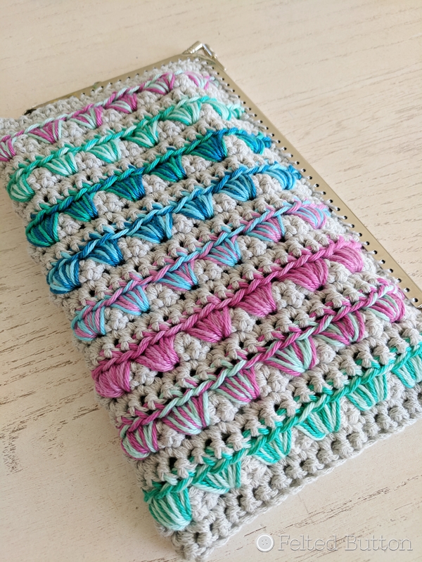 If you want to adjust the width of your pouch, the multiples number is 3 + 2. So just chain your foundation in any multiple of 3 and then chain 2 more. Remember, the pouch is folded in half width-wise before attaching to the frame so keep this in mind when you adjust the width. The height can be adjusted by working additional repeat rows.