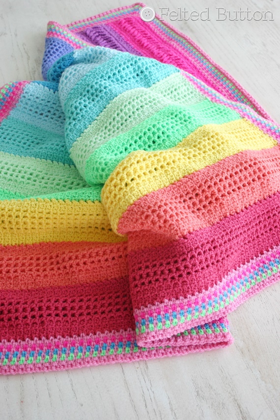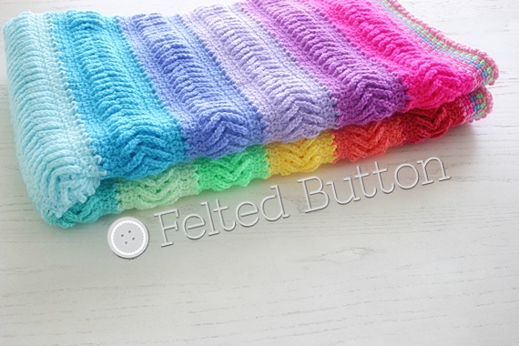 The blanket is constructed in strips with additional strips joining to the previous as-you-go. Beause of this I have rated the pattern for an intermediate crocheter, but with all of the nearly 40 included pictures and explanations, I think an ambitious beginner could easily make it. (Remember, in typical Felted Button fashion, if my patterns contain pictures, they are only for additional assistance and not meant to replace the written pattern.)