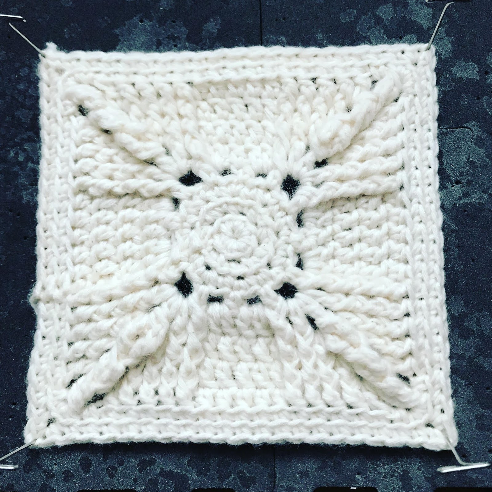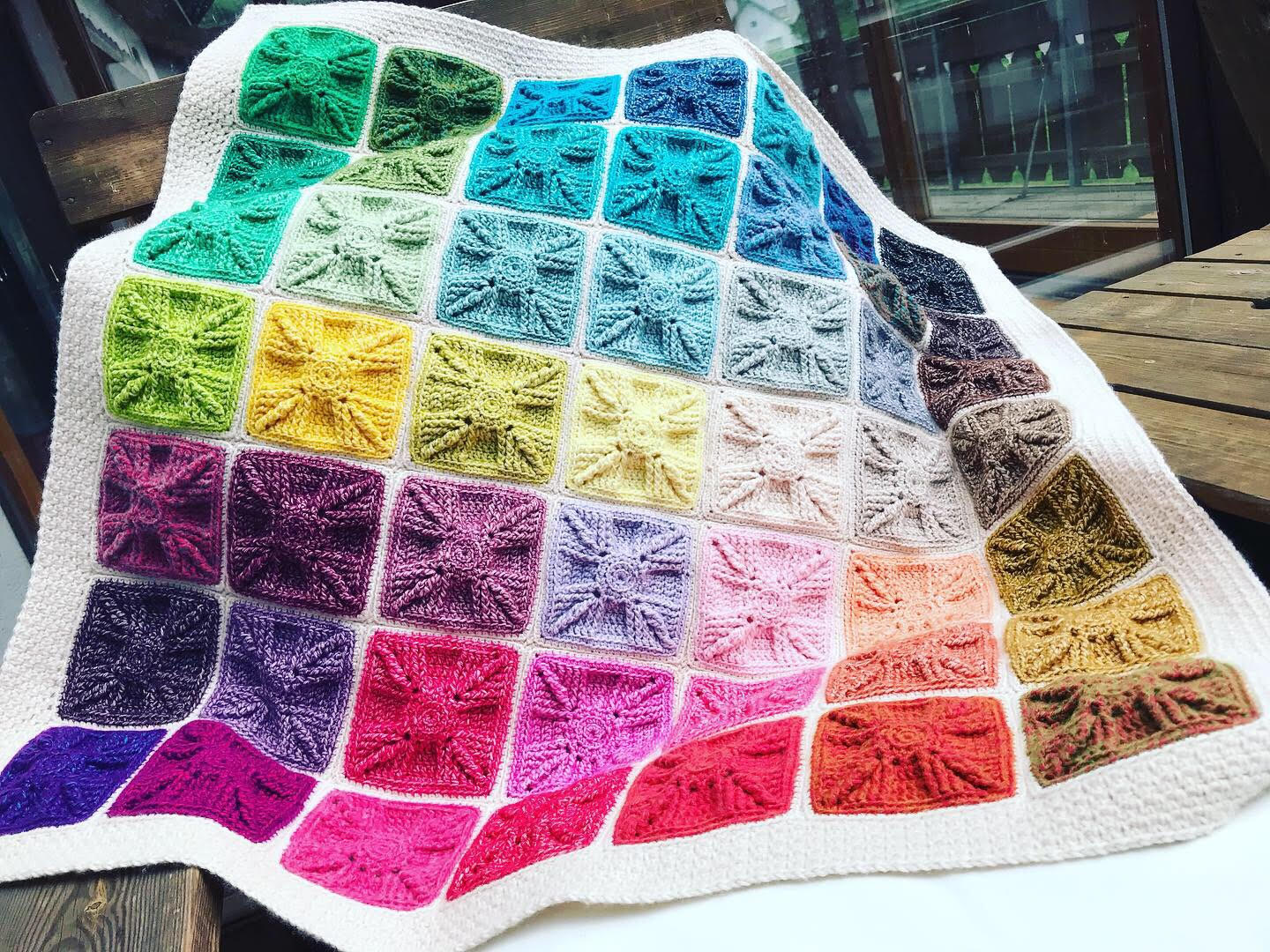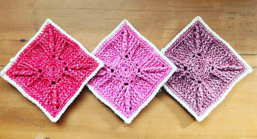 Each square is rounds 1-8 of the Asanas pattern found here, skipping to round 13 to finish.