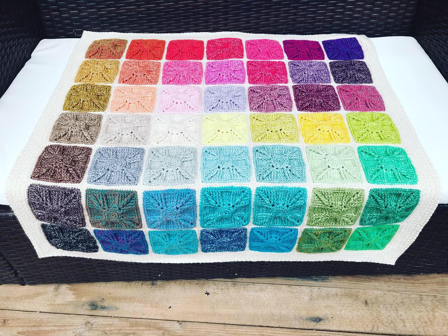 I ultimately chose to go with a vague “color wash” arrangement. Again, there was dithering, and much rearranging of squares, but I like the effect that I got with this. I tried arranging the squares outwards from the paler to the darker, and vice versa. I even thought about color progression in rows, from left to right, down a row and right to left etc., but ultimately this is what I went with. Also I originally wanted to use all the squares including the Moonstone, but with 50 squares that would have ended up being a long thin blanket (5x10) so I left out the Moonstone and ended up with a square blanket instead (49 squares, 7x7). The longer thinner arrangement would work quite well as a bed runner or a wall hanging, though!